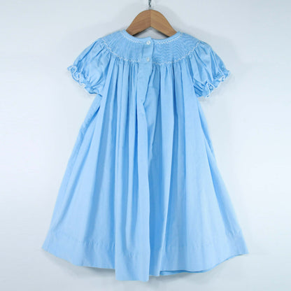 Sky blue girl bishop dress with embroidered details.
