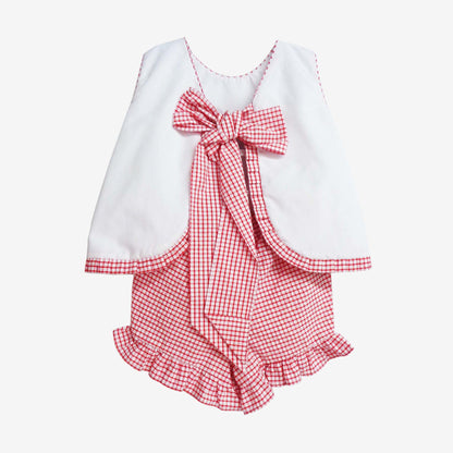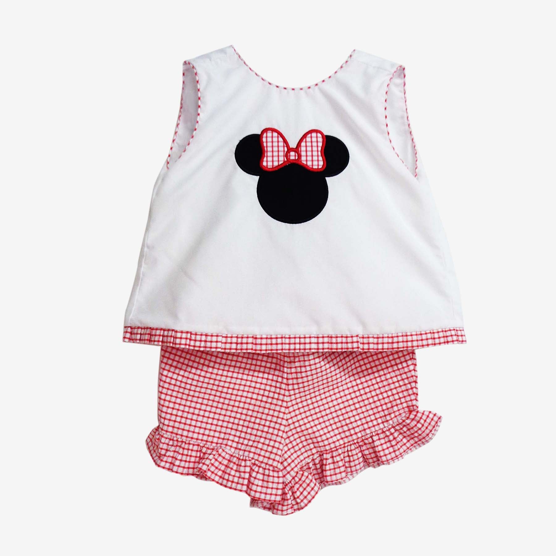 White and red set with Minnie appliqué and tie-back top.